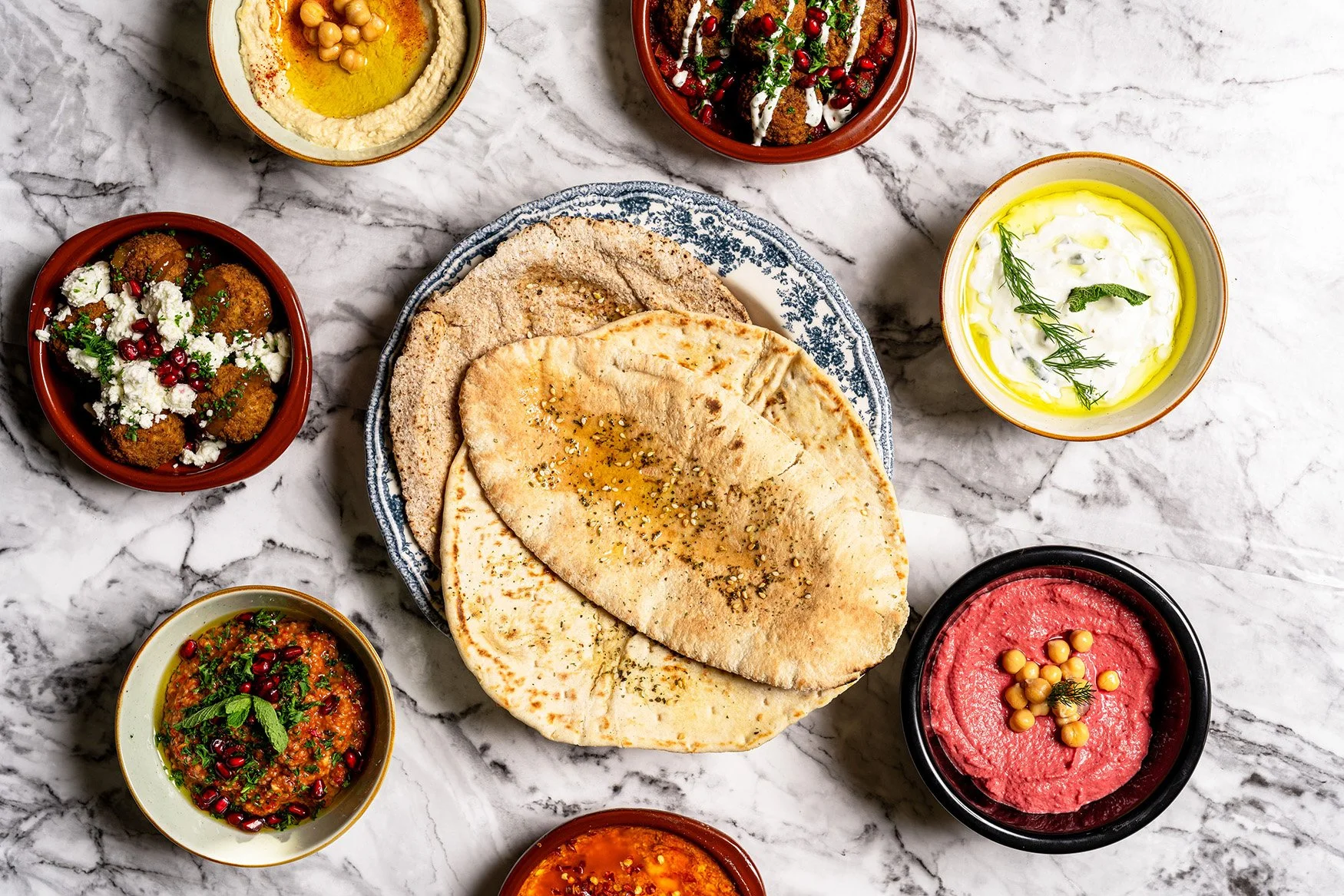 Gevarieerde gerechten met specerijen, mezze en warme gerechten uit de Arabische keuken.